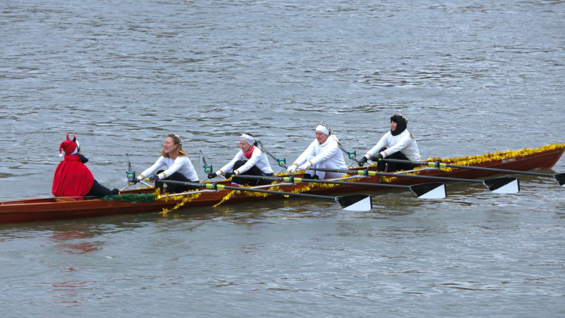 Zum Glück ist ein Ruderer vom FRV, mit dem wir zusammen nach Mainz fahren wollten, mit seinem Auto gekommen, und das konnte die Lichter hinten am Anhänger zum Leuchten bringen. So konnten wir doch noch rechtzeitig zur Mainzer Rudergesellschaft fahren und uns auf die Rennen vorbereiten…indem wir uns etwa verkleidet oder das Boot geschmückt haben, wie es bei der Nikolaus- Regatta üblich ist.