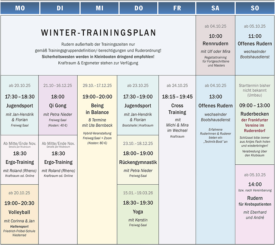 - In der Wintersaison gilt für Kleinboote (Skiff, Zweier/Dreier): Eine unbegleitete Einer-Nutzung wird nicht empfohlen. Bei Nicht-Beachtung dieser Empfehlung erfolgt eine Nutzung auf eigene Gefahr. Das Tragen von Schwimmwesten ist zwingend: bei Wassertemperaturen unter +10 Grad, für RuderInnen in ungesteuerten Klein-Booten (Skiff, 2x/2-/3x), soweit diese außerhalb des regulären Trainingsbetriebs/nicht in Motorbootbegleitung fahren.